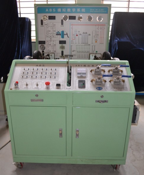 展示ABS/EDS的内部结构与工作原理的教学系统,采用帕萨特全新ABS/EDS系统,是ABS实物部件的运转系统,变频调节器,ABS继电器,ECU,主真空系统,轮速传感器等均已安装并且运转教学系统。控制面板上设置变频调节器,通过变频调节器可调整轮胎的转速。控制面板上设置智能数字式故障模拟设置器及检测终端,可进行各种故障诊断。控制面板上设置四个油压控制阀,通过四个油压控制阀断开、连接及调节各轮内的压力;通过显示面板上的四只轮缸压力表可检测各轮胎的油压和油量;通过显示面板上的四只数字式转速表可检测各轮胎的旋转速度;通过显示面板上的真空压力表检测真空压力;通过显示面板上的电路图便于教学。